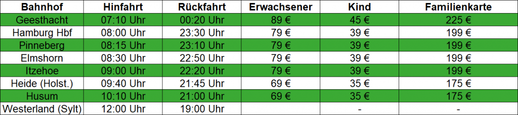 🕓 Fahrt: Hinfahrt am Morgen im historischen Sonderzug von Hamburg-Altona nach Westerland auf Sylt, Rückfahrt Abends