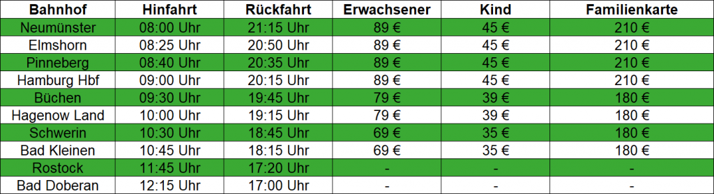 Aufgrund unvorhergesehener Bauarbeiten der DB InfraGo zwischen Grevesmühlen und Bad Kleinen muss unsere Fahrtroute geändert werden. Die Umleitung erfolgt über Büchen, ein Halt in Ahrensburg, Bad Oldesloe, Lübeck und Grevesmühlen ist nicht möglich. Die neuen Fahrkarten sind ab sofort buchbar.